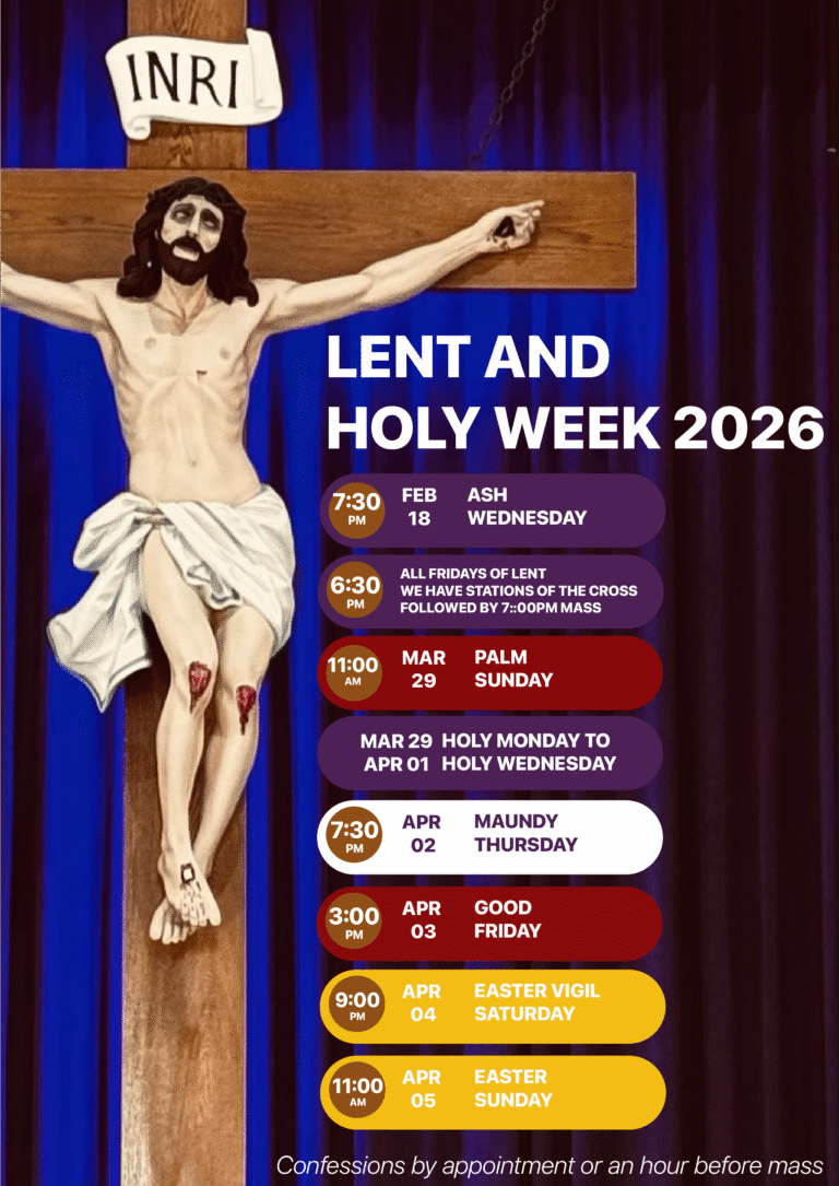 Sacrament of reconciliation half-hour before Mass or any time by appointment