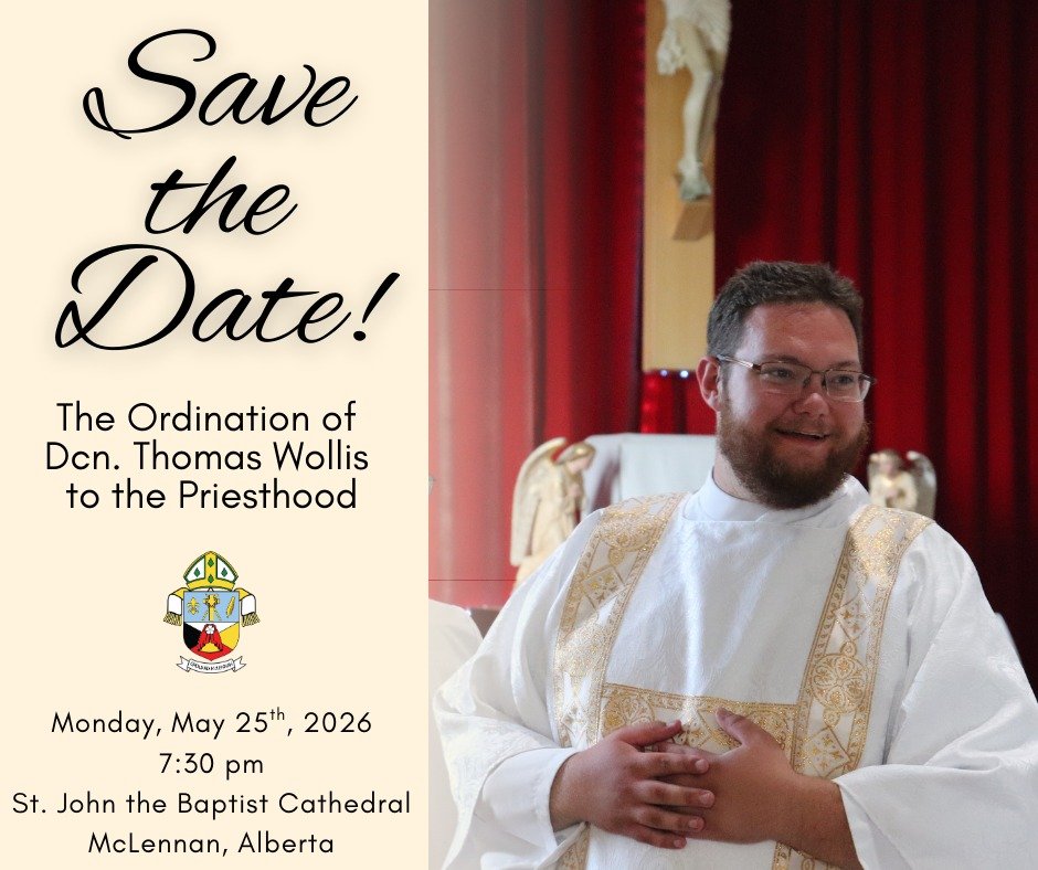 We are proud to announce the date for the presbyteral ordination of Dcn. Thomas Wollis to the priesthood. The ordination will be held on Monday, May 25th, 2026, 7:30 pm at St. John the Baptist Cathedral in McLennan.